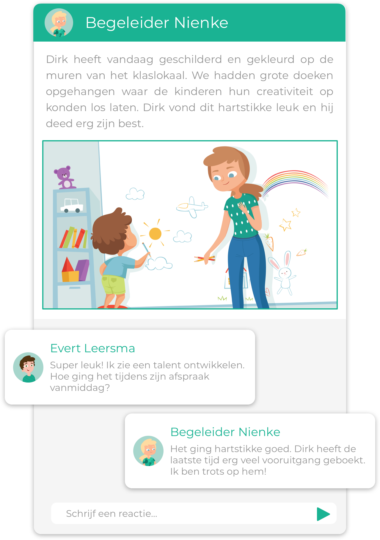 Met Schriftje kun je met één druk op de knop een verhaal schrijven rondom je begeleiding. Hierin kun je met ouders of andere begeleiders informatie delen. Foto’s, begeleidingsplannen of je begeleidingsverslag - zet het makkelijk klaar in Schriftje. Anderen kunnen reageren. Zo blijft iedereen op de hoogte.